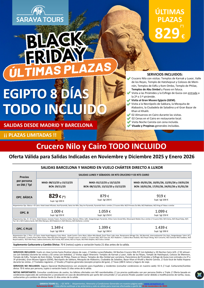 Últimas Plazas Especial Black Friday Egipto Todo Incluido 8d. Crucero Nilo y Cairo + visitas, visa y propinas